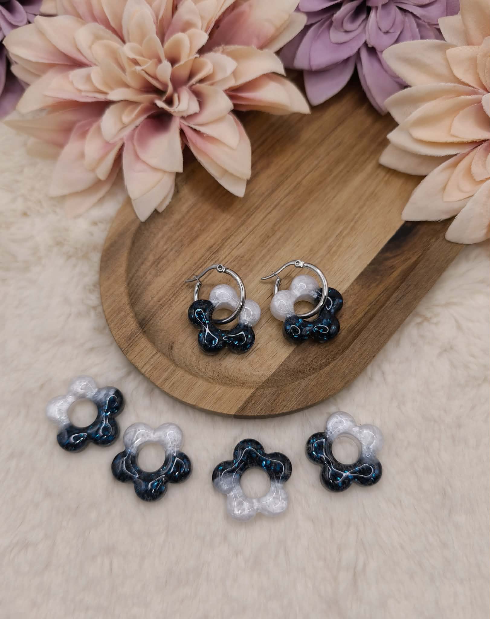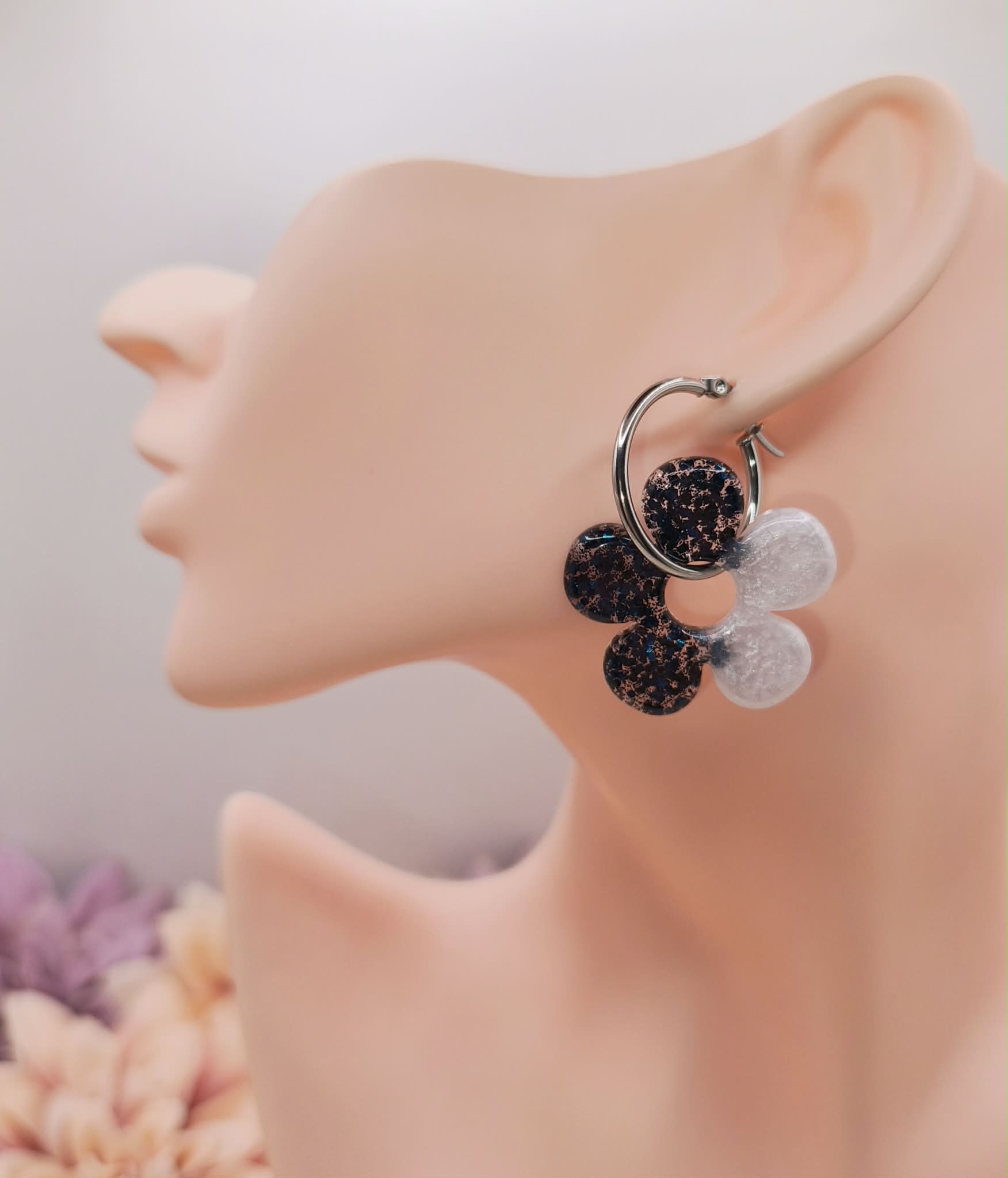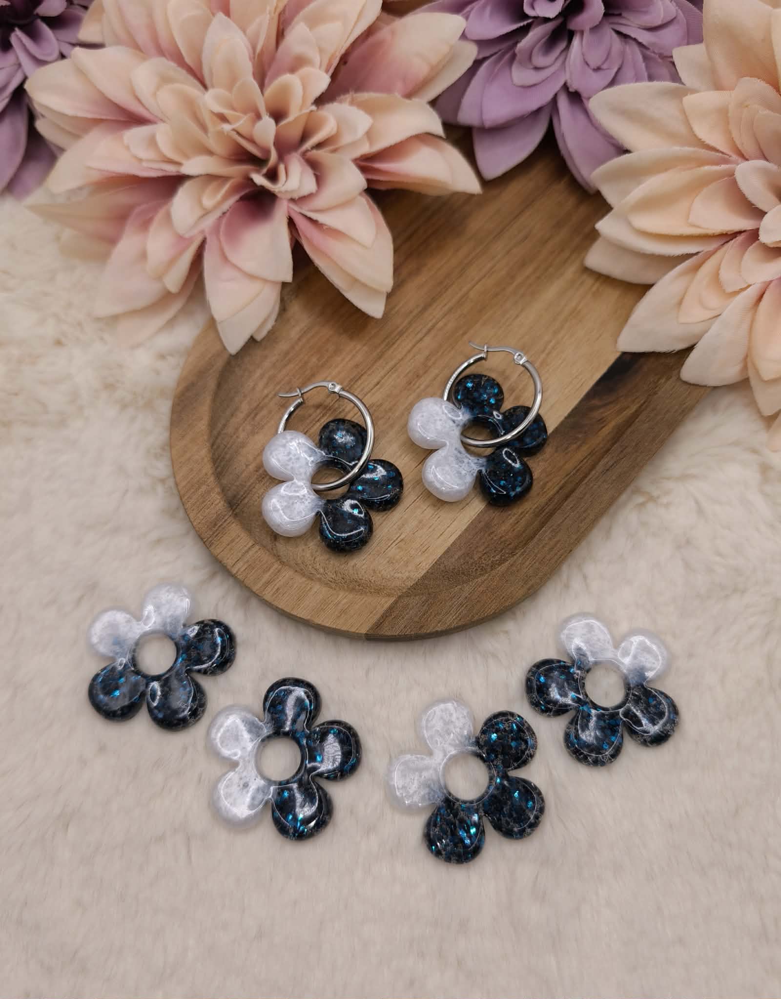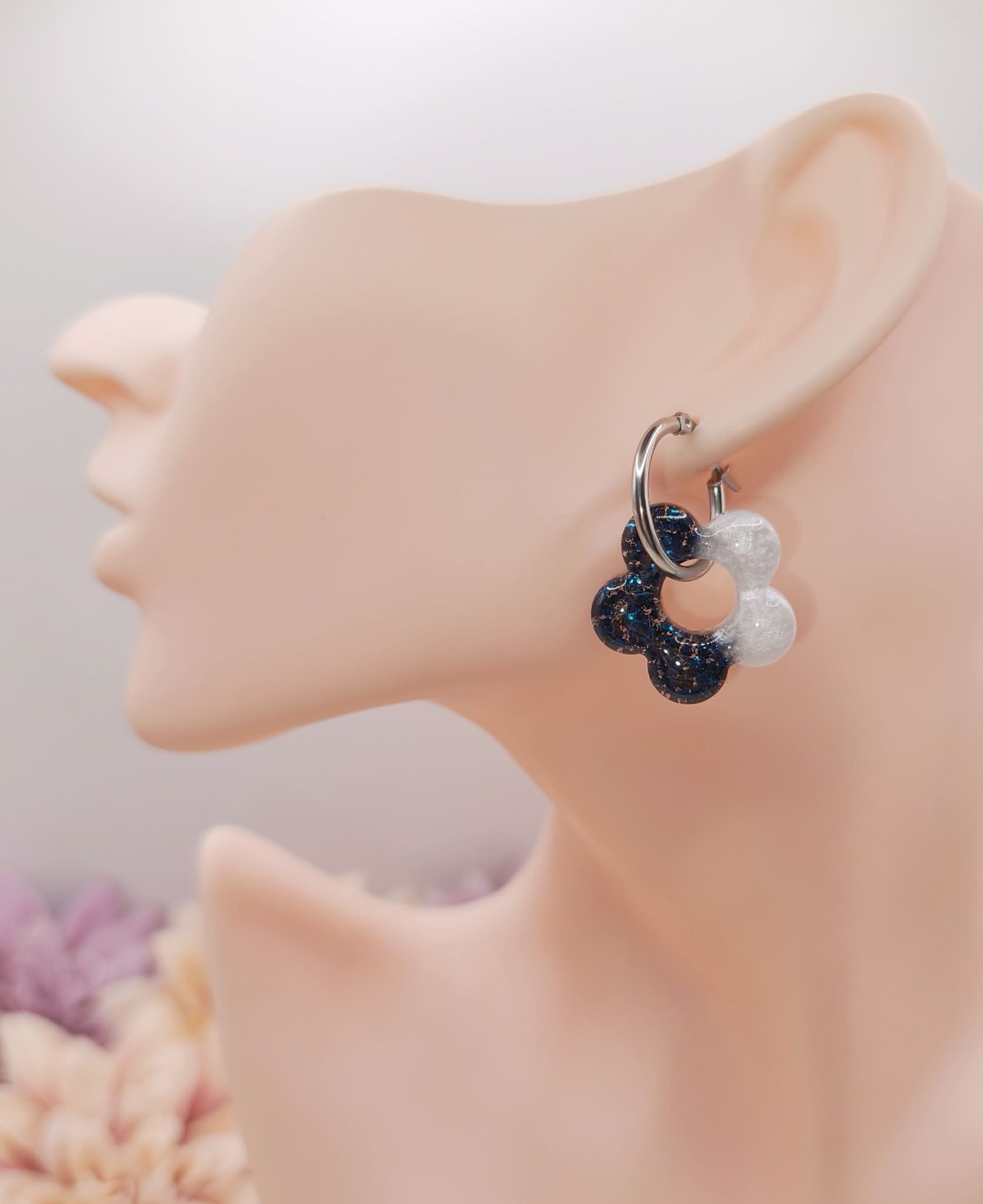 Petites ou grandes fleurs, ces pampilles mêlent nacré lumineux et paillettes bleu foncé 🌌